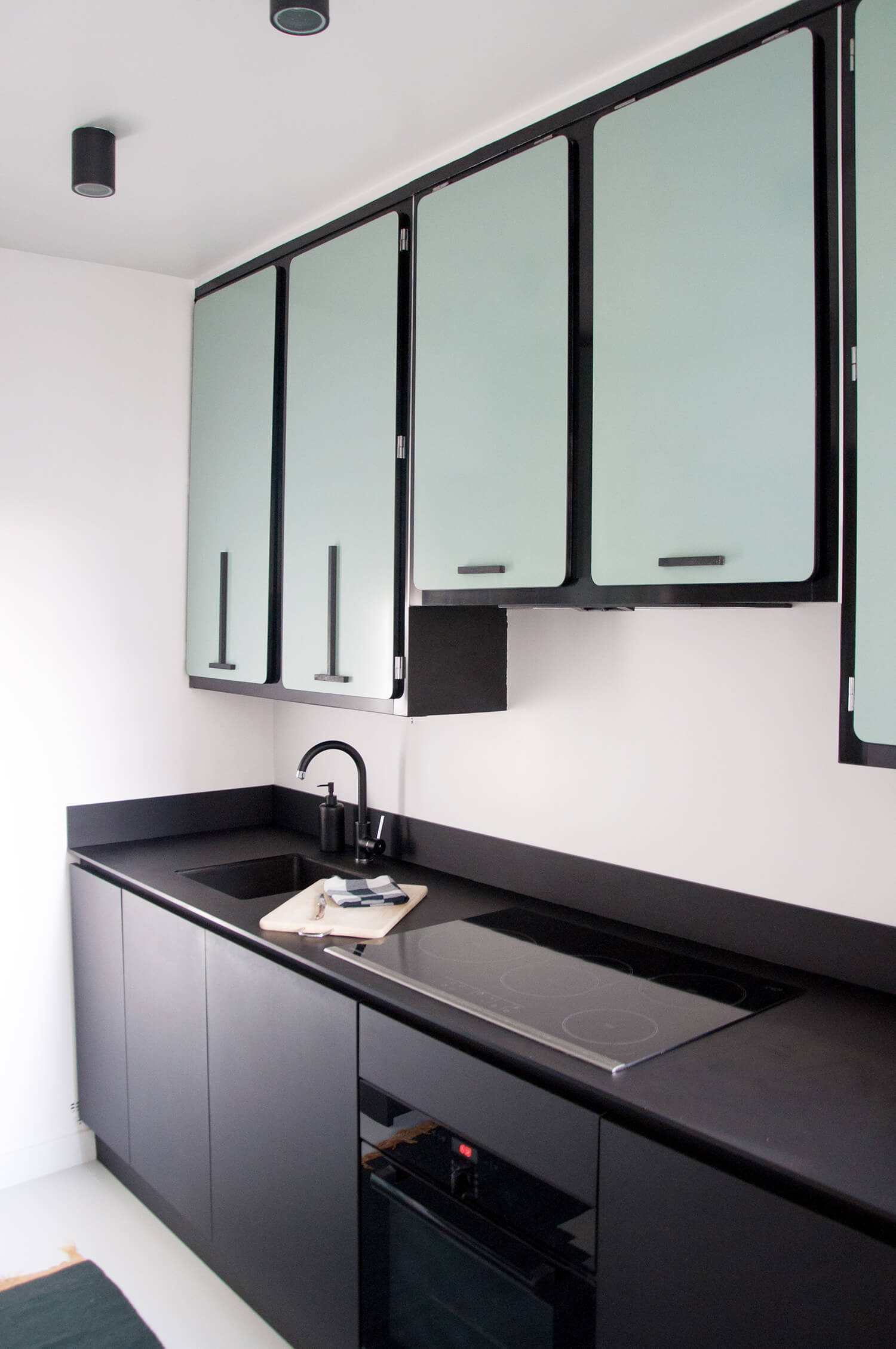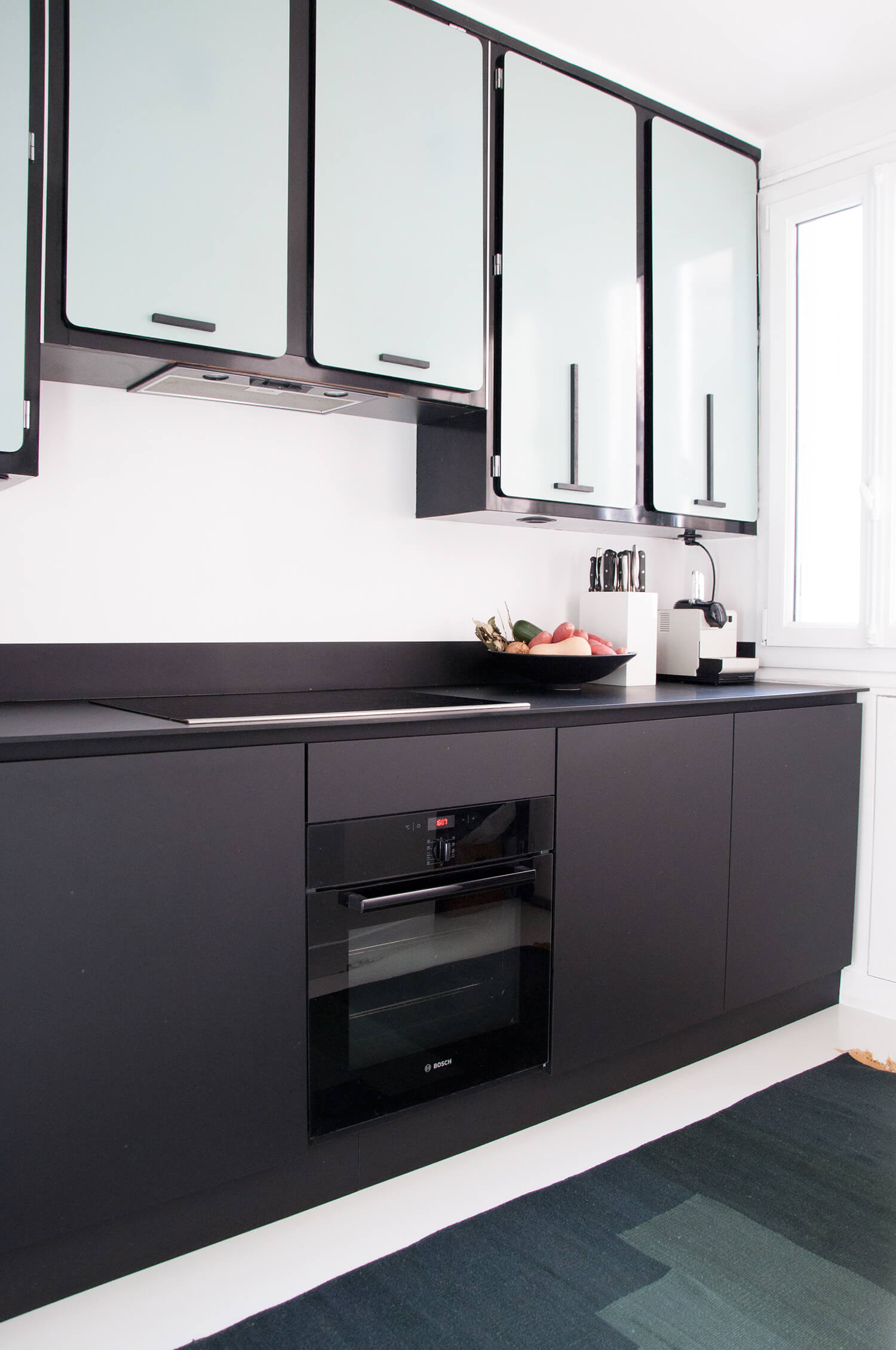 Pour conserver l’âme des lieux, les placards en Formica des années 60 ont été conservés et complétés par des éléments noirs mats aux lignes contemporaines, réalisés sur mesure pour que l’aménagement de la cuisine s’adapte vraiment aux volumes et aux besoins de la famille.