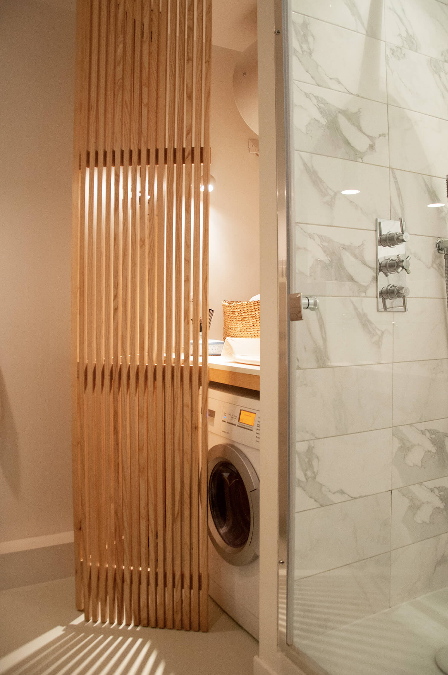 On aime le claustra qui vient camoufler le coin buanderie et apporter une touche graphique à l’ensemble !