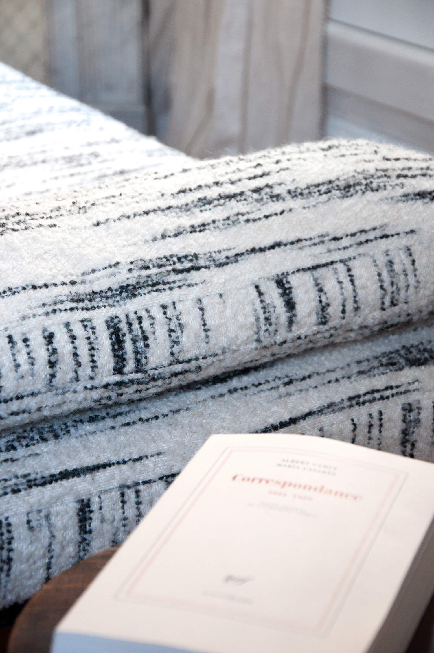 Le linge de lit et la tête de lit se veulent sobres ; la couleur est apportée à travers des accessoires : deux coussins en coton gaufré jaune et des rideaux en lin foncés viennent donner du contraste à cette pièce, véritable écrin de douceur.