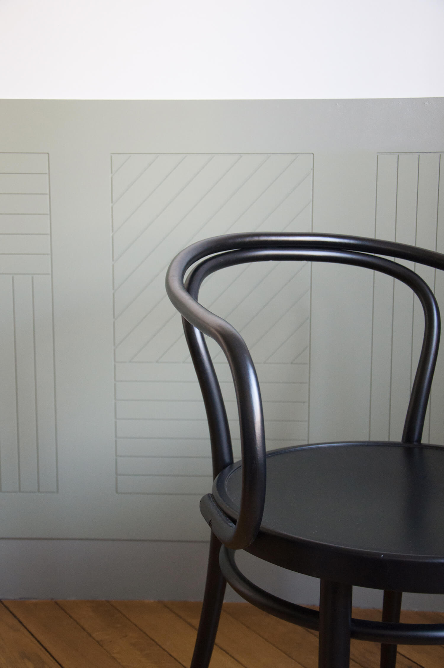 Salon et salle à manger se côtoient grâce à des espaces semi-ouverts. Le mobilier se veut éclectique : ici, on aime mixer le neuf et le chiné, les différents styles et les époques. Le vert est une couleur omniprésente, que cela soit sur des éléments imposants comme la bibliothèque et les boiseries aux motifs inspirés des vitraux de l’abbatiale de Conques dans la salle à manger ; ou sur la banquette dans le salon.
