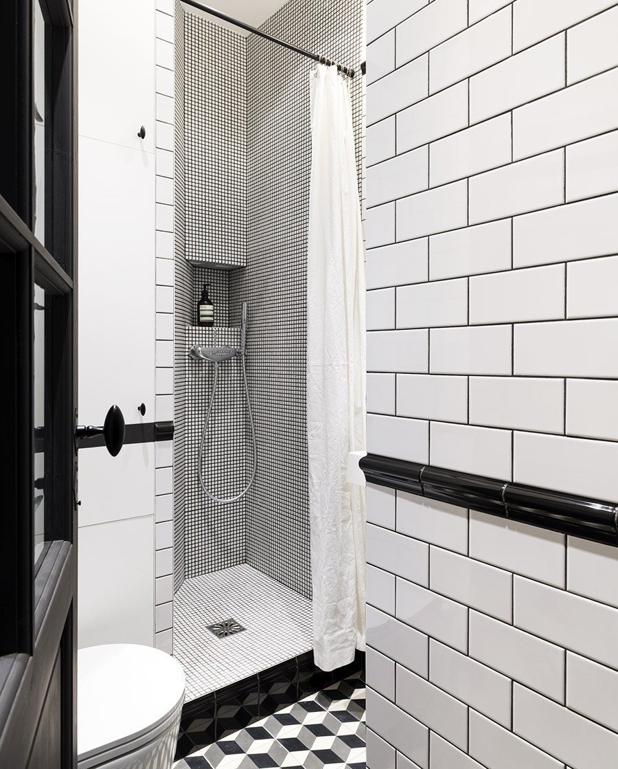 Peindre les murs en kakiUn petit appartement parisien très chaleureux Cuisine avec sol en carreaux de cimentSalle de bain noire et blanche