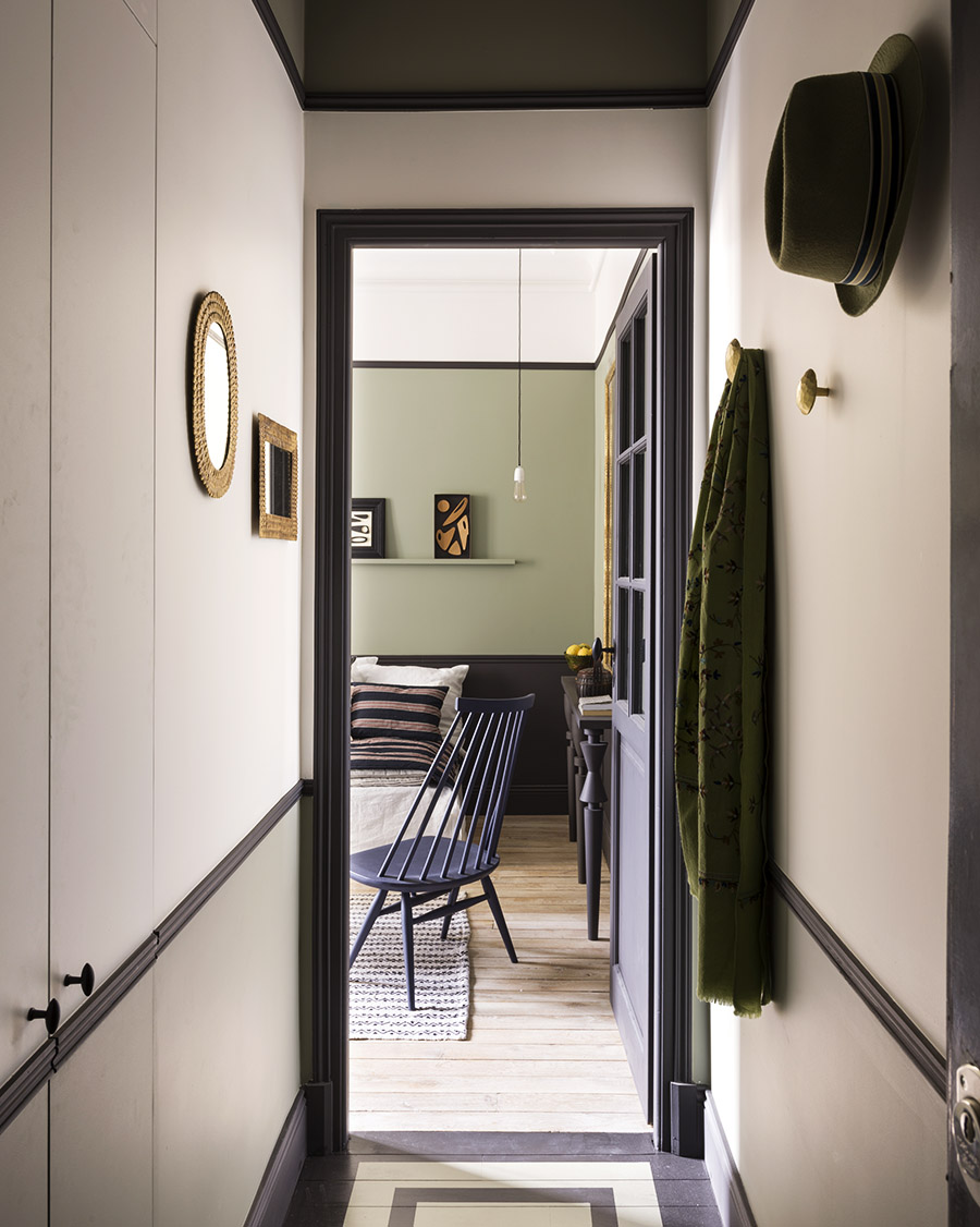 Comme toujours, les couleurs profondes sont sa marque de fabrique. Pour cet appartement, elle a accentué les lignes horizontales créées par les moulures en utilisant trois couleurs différentes : du blanc, du kaki et du noir. Cela donne un charme fou à la pièce !