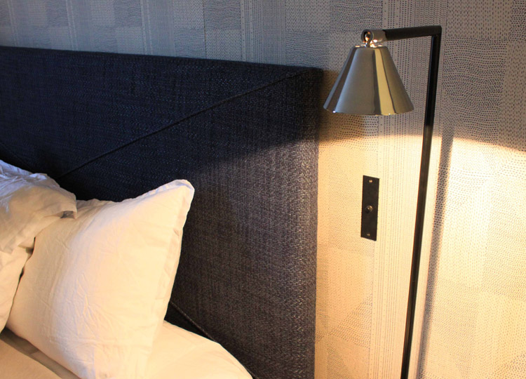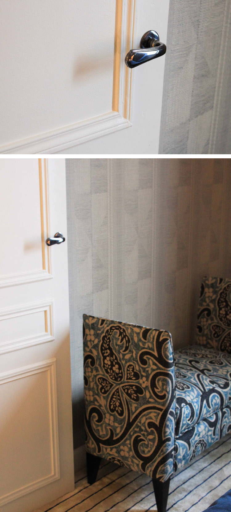 Dans la chambre des Maîtres, on reste sur des tons bleus, une véritable invitation au repos et à la détente. Aux murs, le motif est discret mais a son petit effet, c’est là toute la subtilité des motifs ! Savoir jouer avec sans nous aveugler.