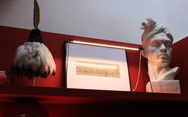 Un magnifique Juju Hat de couleur rouge habille le mur de manière poétique.