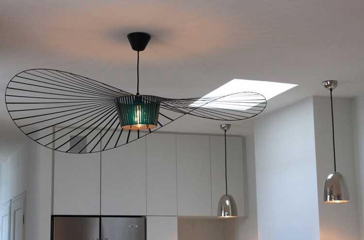 Enfin la cuisine, dominée par la suspension Vertigo de Constance Guisset (dois-je préciser que mon coeur était tout émoustillé ?!) est graphique et chic. Du noir, du blanc, du bois, du marbre… Intemporel vous dis-je !