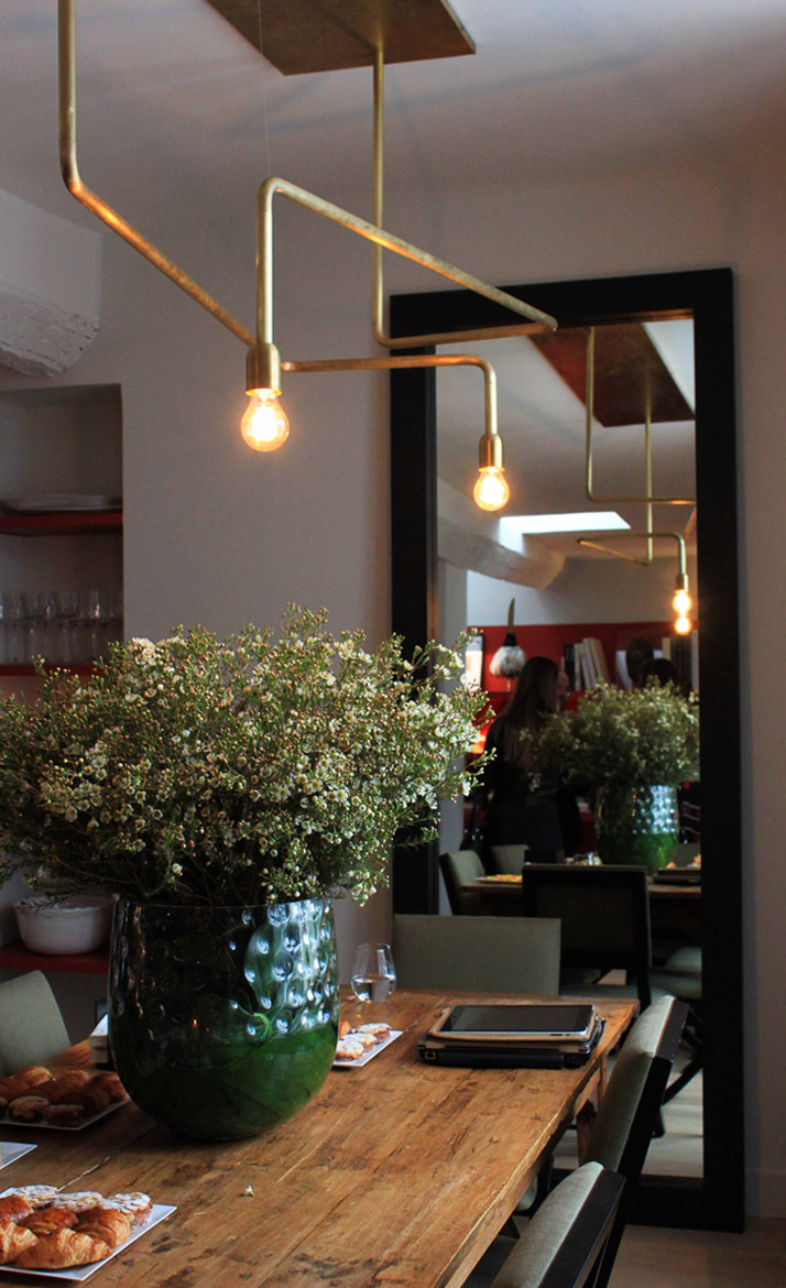 Juste à côté, une belle table de repas en bois massif trône devant une fenêtre et un second miroir. La suspension qui la surplombe est un énorme coup de coeur ♥