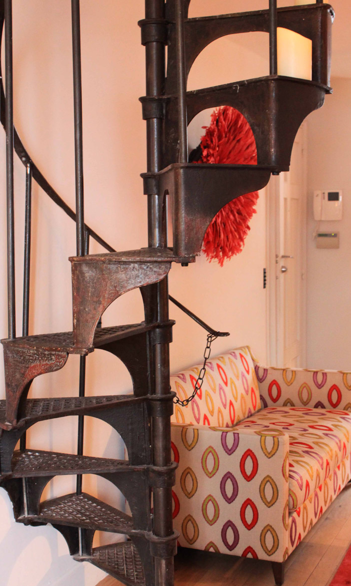 L’escalier qui permet l’accès à la mezzanine a été chiné, pourtant, on pourrait croire qu’il a toujours été là tellement il s’intègre parfaitement à l’espace.