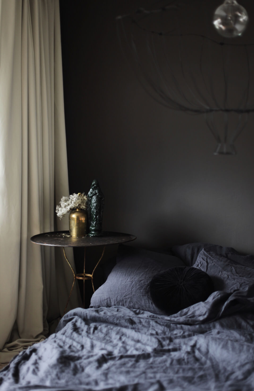Le noir donne souvent une impression d’étouffement et de tristesse. Et pourtant, c’est une teinte enveloppante et élégante : je la trouve vraiment parfaite pour la décoration d’une chambre !