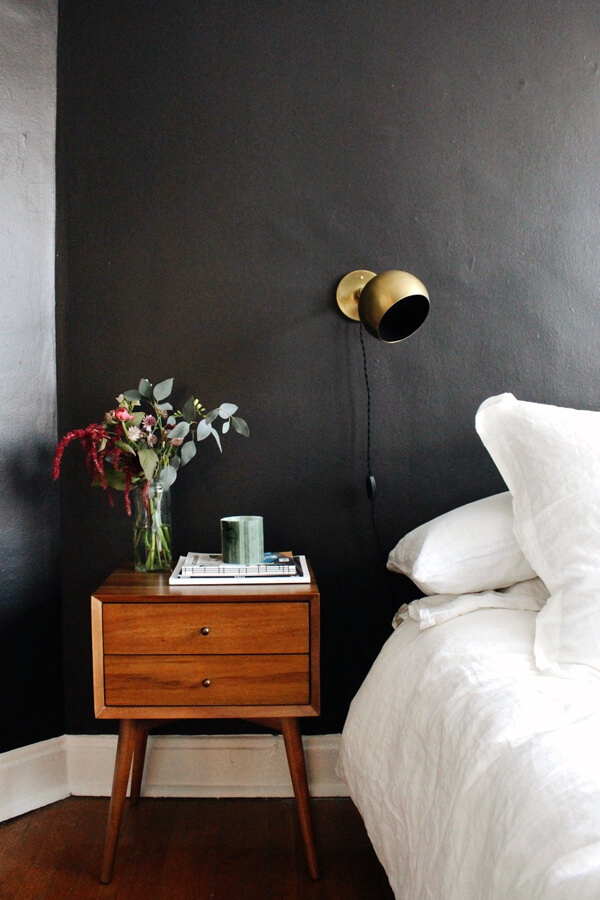Ici, le mur noir est sublimé par du linge de maison blanc, un luminaire en laiton doré, un chevet en bois et une note végétale. C’est une ambiance parfaitement équilibrée !