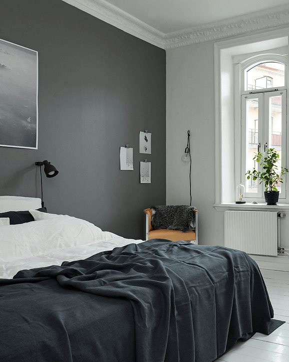Dans cette chambre, la belle hauteur sous plafond est mise en valeur par le noir.