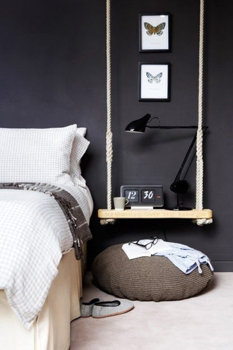 On aime cette décoration de chambre noir avec sa balançoire en guise de table de chevet !