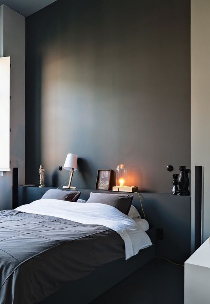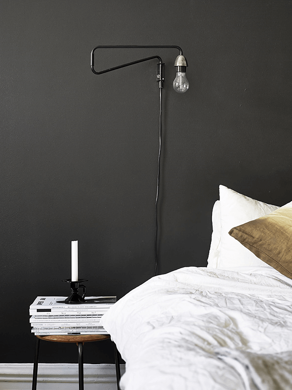 Le noir est souvent associé au à la décoration style industriel. Dans cette chambre, on aime l’effet ton sur ton du mur associé à une applique murale tubulaire.