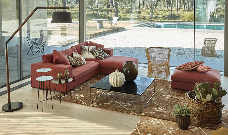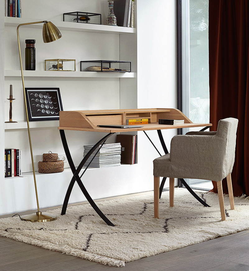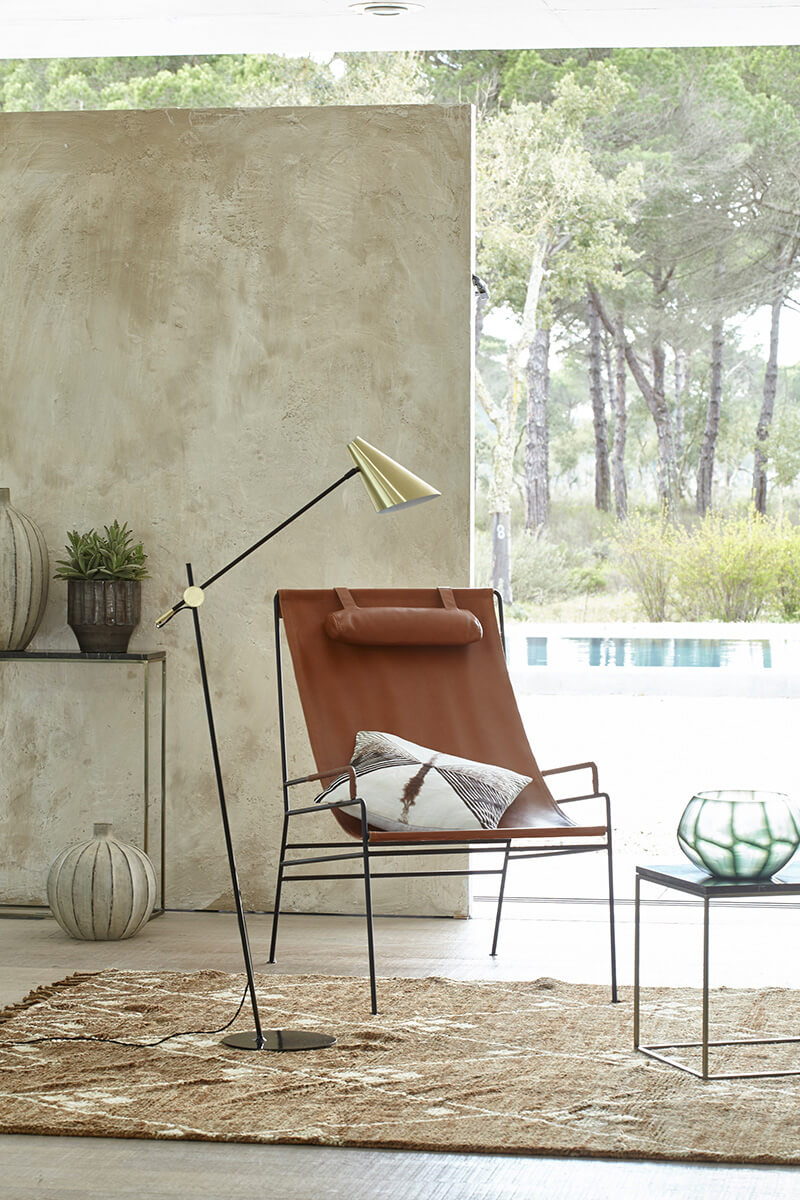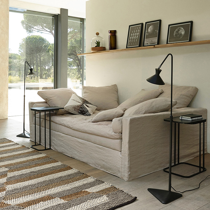 Pour notre salon, je craque pour  ce bout de canapé en métal doré lui aussi… Sans parler des nouvelles couleurs du linge de lit en lin, des petits chevets en chêne clair et de cette jolie console aux lignes arrondies !
