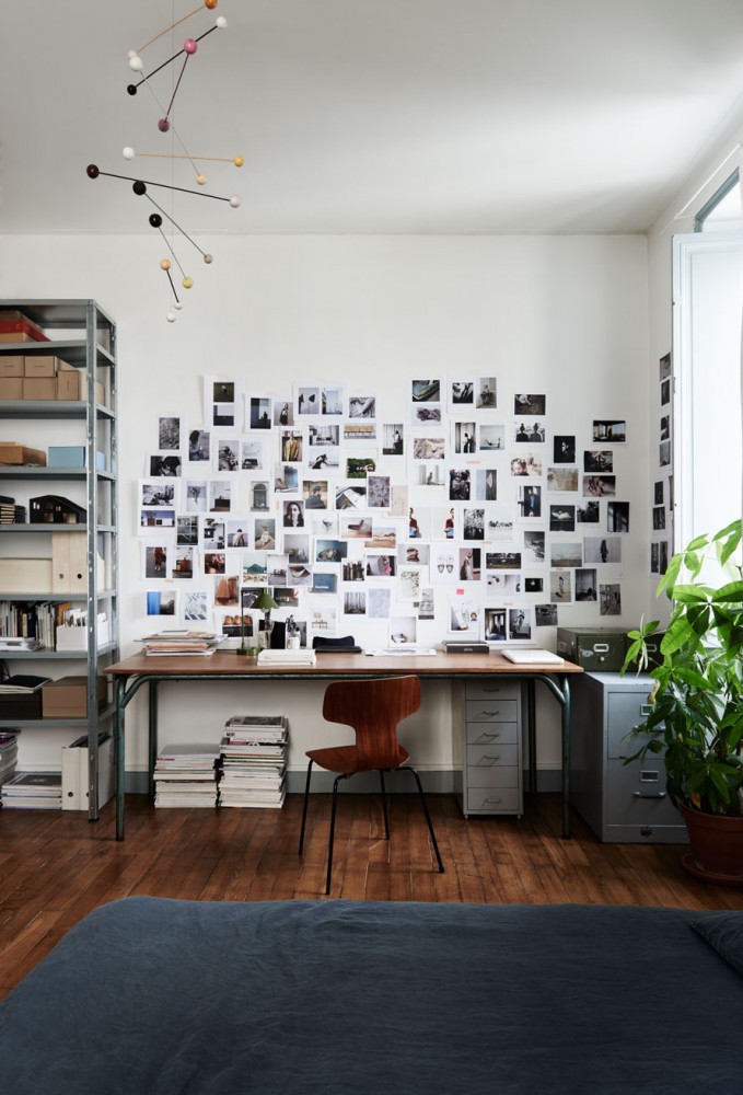 On aime : la guirlande guinguette ; les bouquets de fleurs fraîches et séchées ; la lampe potence ; et l’accumulation de photos accrochées au mur devant le bureau.