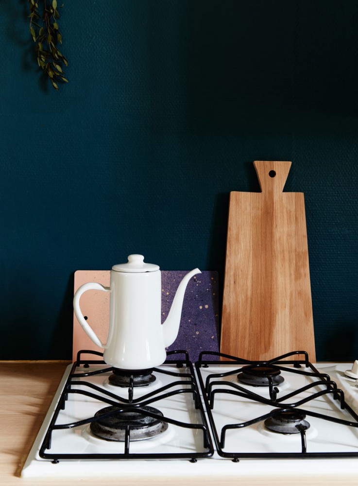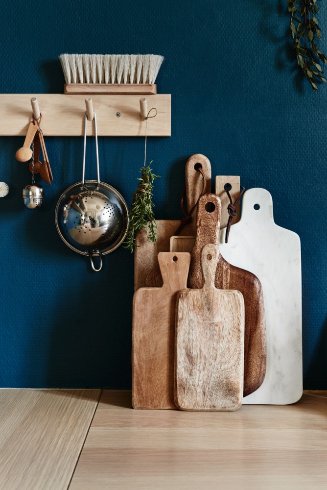Pour ajouter encore un peu plus de charme, les portes, encadrements de fenêtres et soubassements ont été peints dans un bleu-gris très élégant. Dans la cuisine, la crédence est quant à elle, peint dans un bleu très profond qui se marrie très bien avec la collection d’ustensiles en bois.