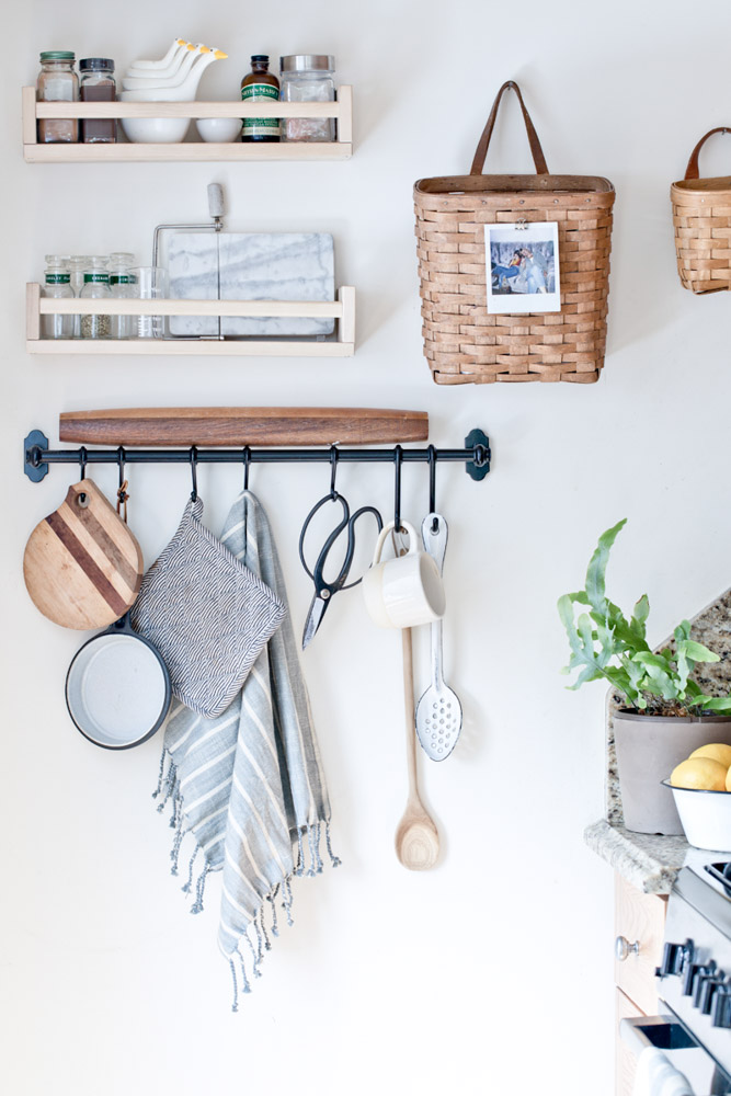 Qu’on suspende une simple branche de bois flotté, qu’on opte pour une patère en bois aux formes épurées ou pour des barres en inox plus contemporaines, le fait de suspendre vos objets vous fera gagner de la place dans vos placards et sur vos plans de travail, tout en vous permettant d’avoir vos objets du quotidien à portée de main.