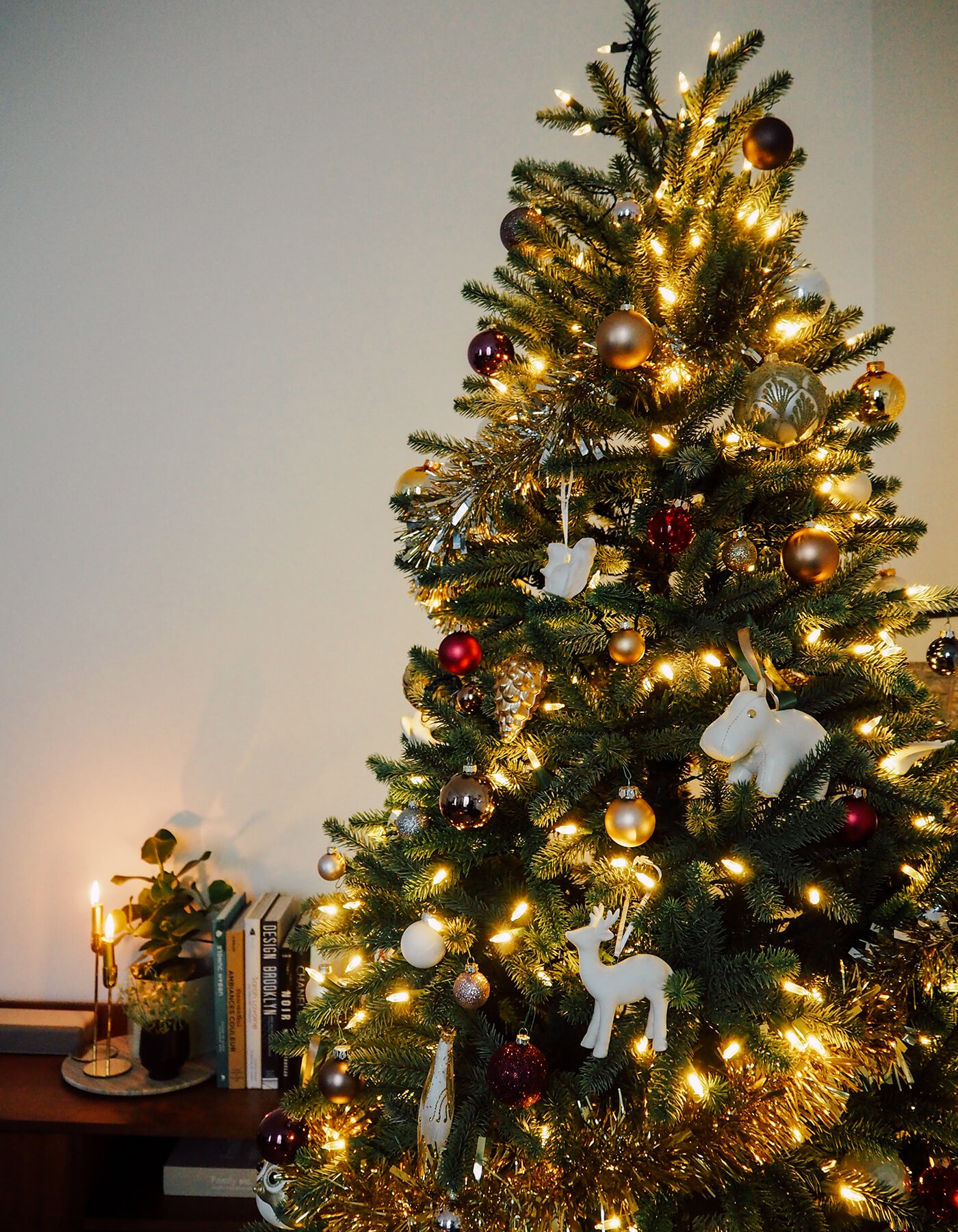 À la maison, nous aimons beaucoup Noël. Alors après avoir partagé ma table de Noël avec vous, j’avais envie de vous montrer notre sapin, qui trône fièrement dans notre salon.