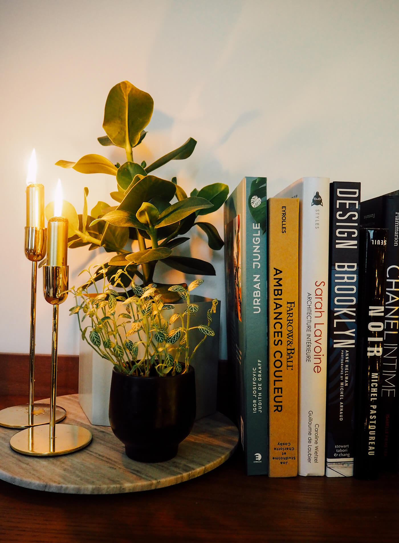 Sur la table basse, mon plateau doré Alessi regorge de petits trésors : mes bougies, mais aussi des gourmandises le soir venu, une fois que Robin est au lit.