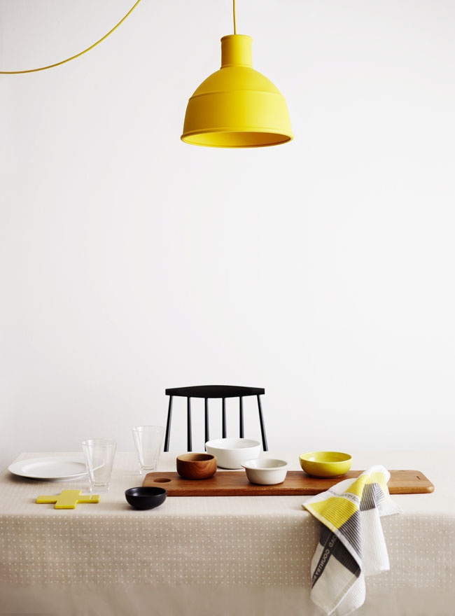 Mais pourquoi pas un fauteuil ? Ou les coussins d’un fauteuil ? Je craque tout particulièrement sur ce beau modèle et son association jaune / bois ! (Et pour le luminaire aussi tant que j’y suis !)