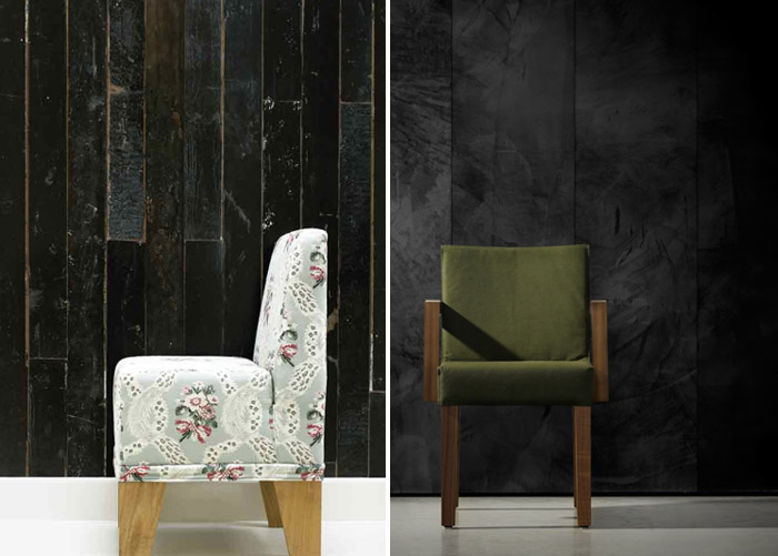 Chez BODIE and FOU, deux papiers peints noirs en trompe l’oeil : un premier qui imite un plancher en bois, et un second qui imite un béton ciré, très contemporain.