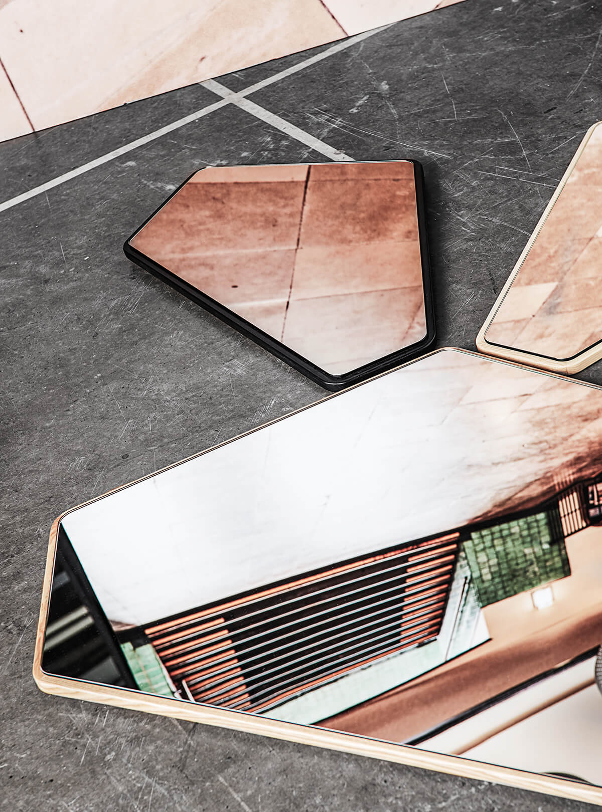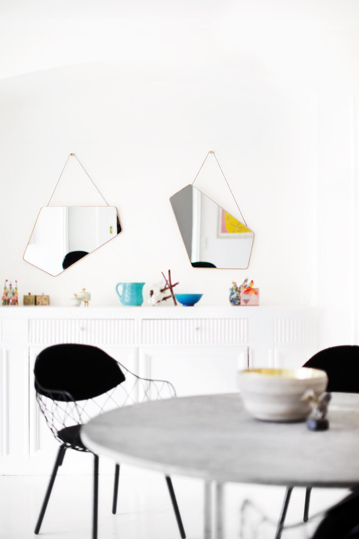 Avec des points d’attache à chaque coin, le miroir asymétrique Ego Mirror imaginé par le studio Design By Us a la particularité de pouvoir se suspendre de 5 manières différentes.