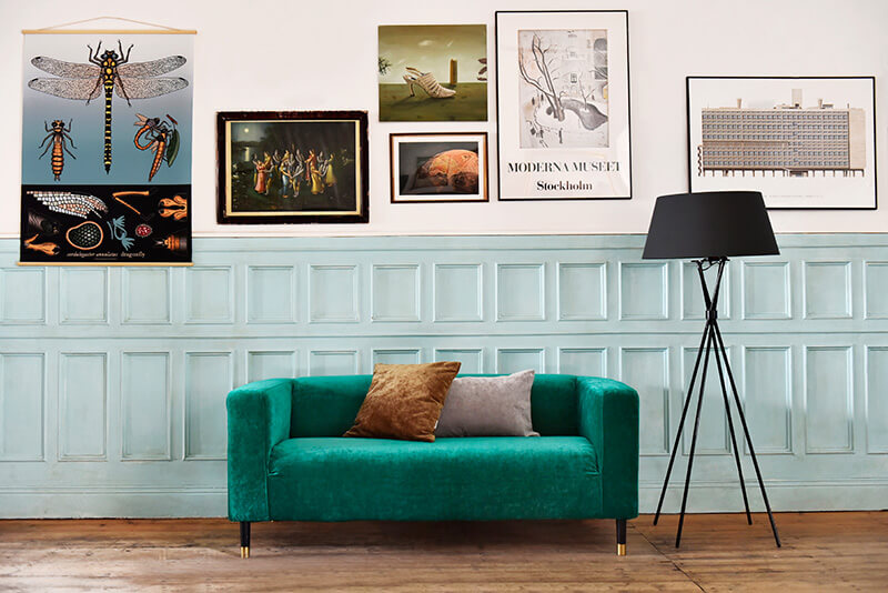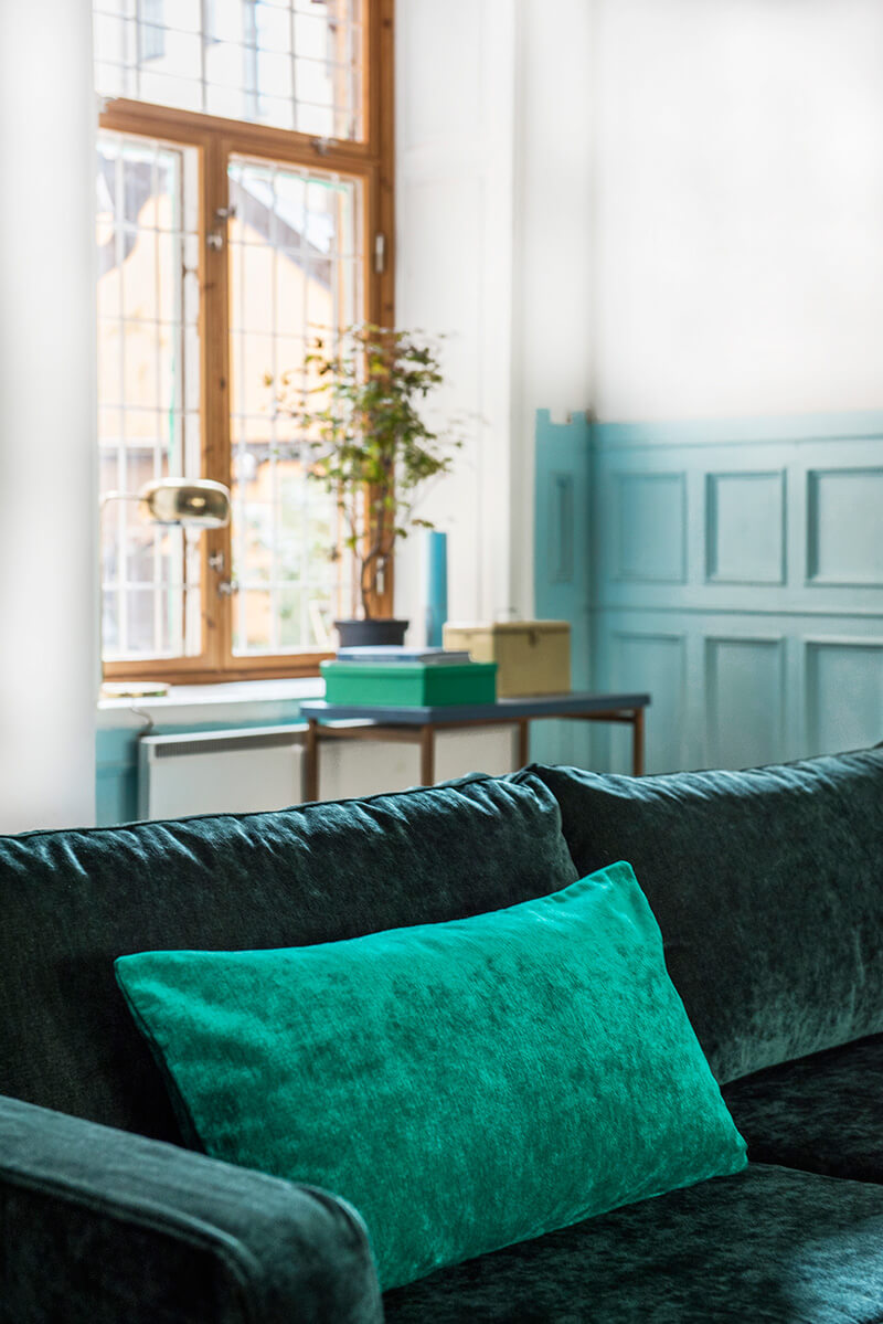 A green velvet sofa