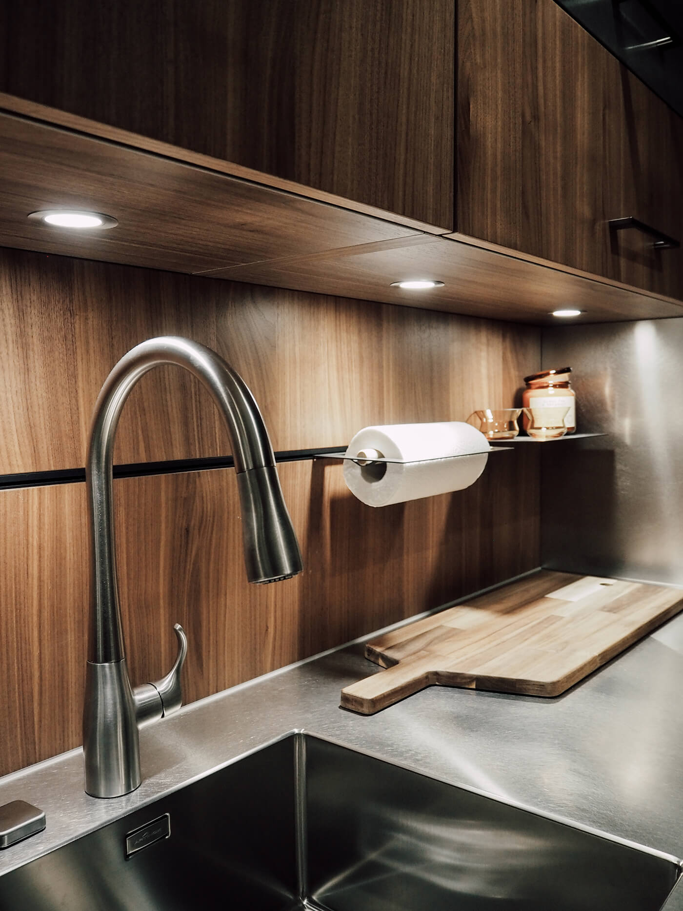 Ici, ce sont de tout autres matériaux qui sont mis en valeur : avec un décor en noyer, des portes vitrées fumées et de l’inox, les façades hautes et basses se répondent et créent un contraste résolument moderne.