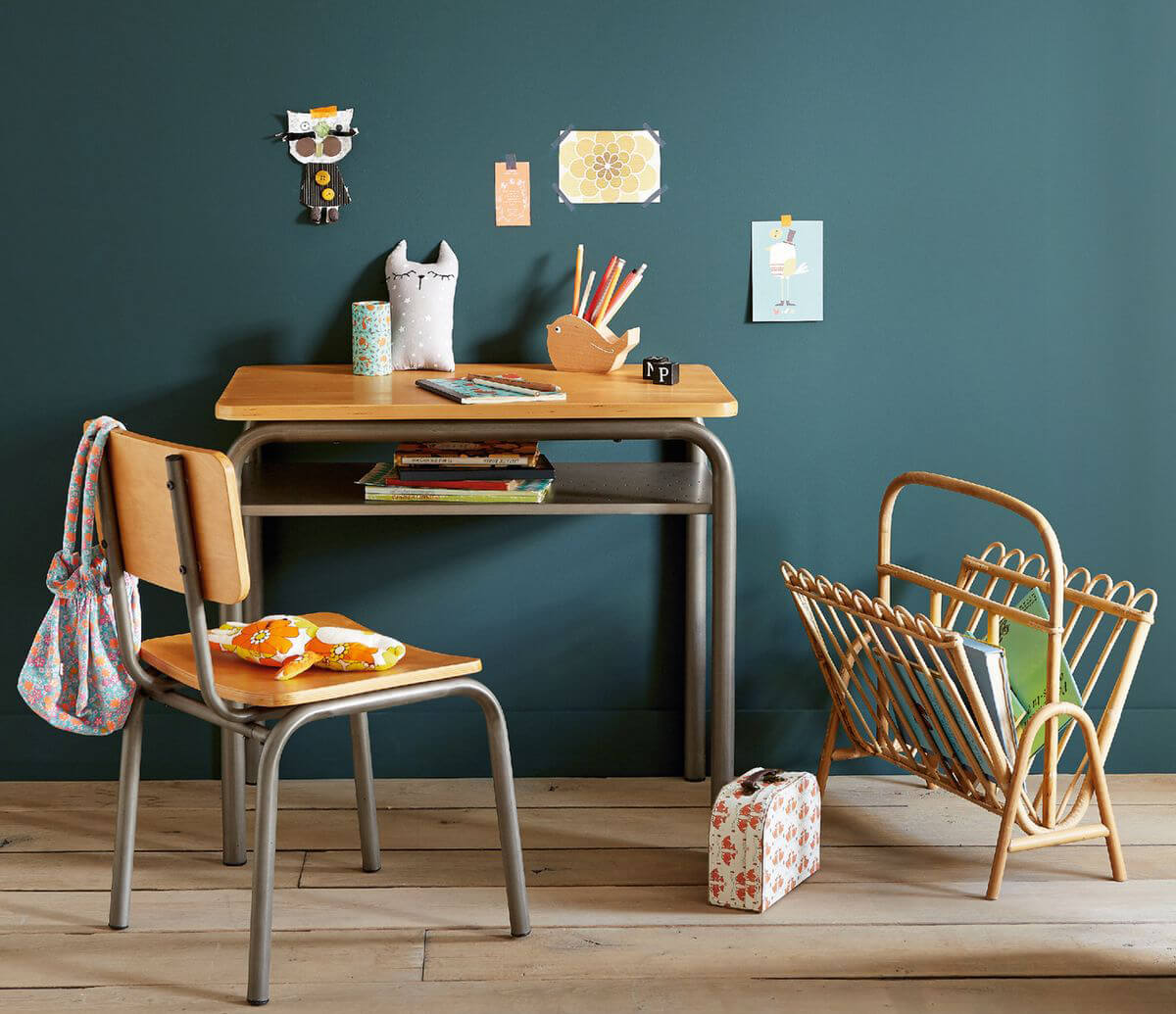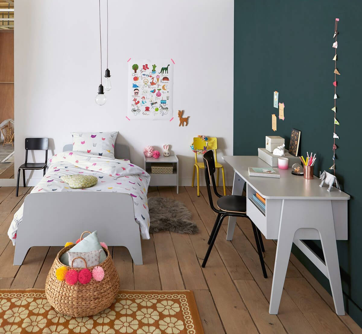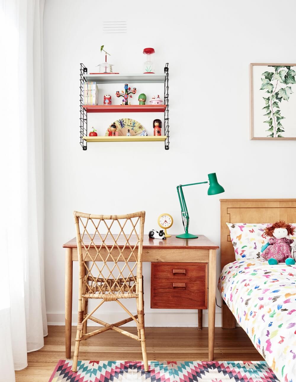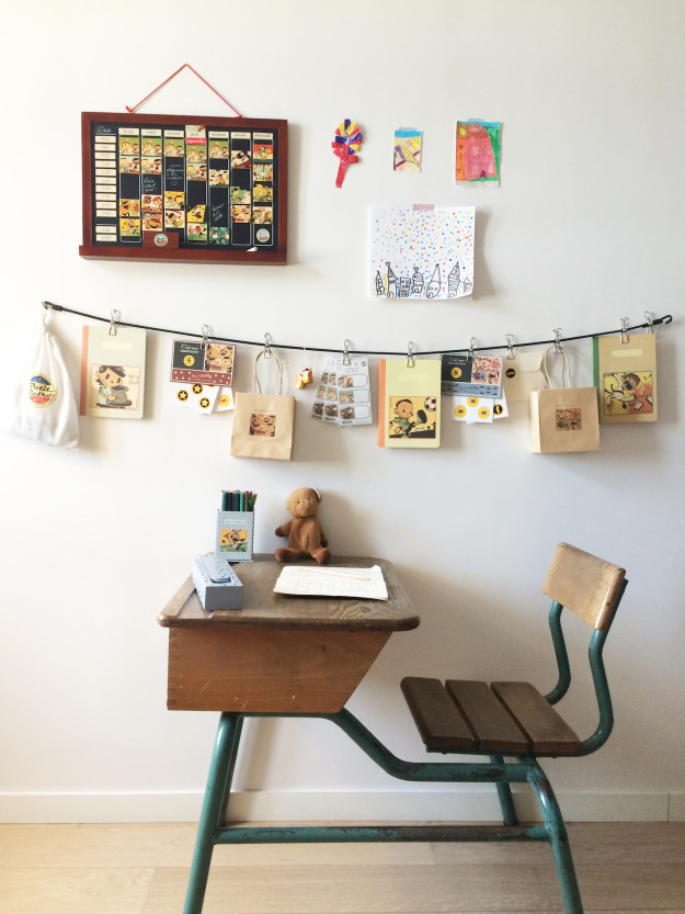 Et en parlant de rangements, on n’oubliera pas de miser sur des accessoires ludiques et pratiques, comme des bacs de rangements, des pots à crayons… Vous pouvez aussi opter pour de jolies étagères pour exposer les livres d’école ou d’autres trésors ! On ajoutera également une belle lampe de travail, et le tour est joué.