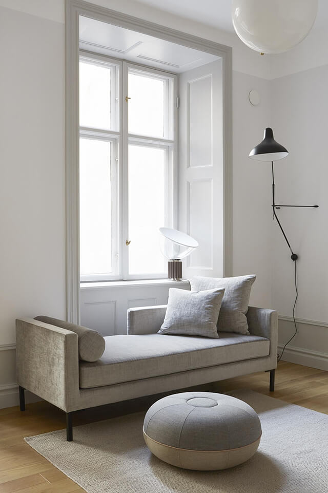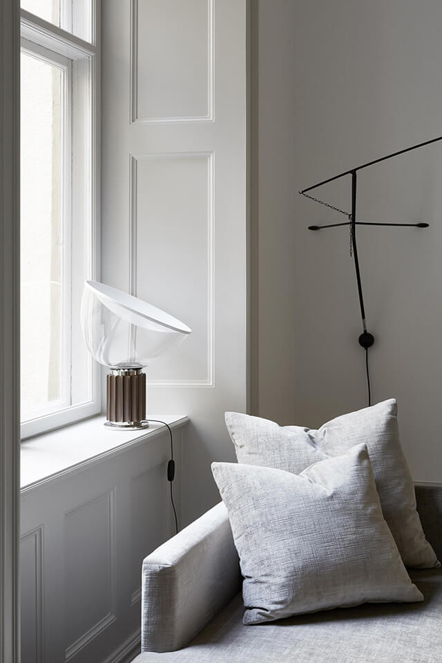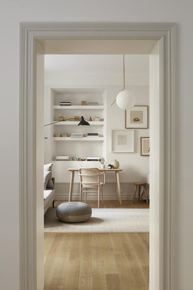 Plus loin, une niche qui sert de bibliothèque marque l’espace bureau. Cette fois encore, c’est une lampe potence de chez DCW Éditions qui éclaire joliment cette zone. C’est aussi un élément graphique très élégant, qui vient ajouter un peu de contraste à la pièce. Elle occupe également le daybed, qui sert ici de canapé.