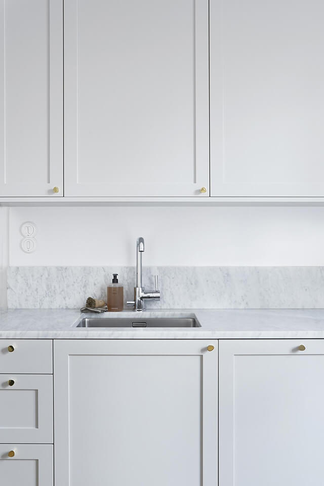 La cuisine est suffisamment grande pour accueillir un coin salle à manger pour deux. Le blanc des meubles et le marbre du plan de travail sont réchauffés grâce à la table de repas et aux chaises scandinaves en bois clair.