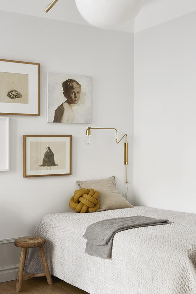 Près du mur, le coin lit est délimité grâce à une accumulation de cadres et à une lampe potence dorée.