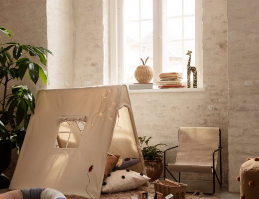 Une collection qui sent bon l’été, et les vacances qu’on imagine passer dans une grande et belle maison en Toscane, entourée de pins et d’oliviers. Ici, le vert olive, le rose et la terracotta ne font qu’un avec le jaune soleil. Les textiles se parent de dentelles et de broderies, qu’on mixe avec des céramiques artisanales et des carreaux de ciment. Une ode à la Dolce Vita en famille.