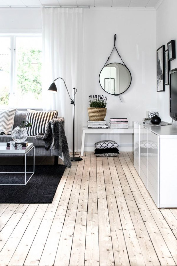Plus discret, ce miroir rond noir apporte une légère touche de contraste dans cet intérieur aux teintes relativement claires.
