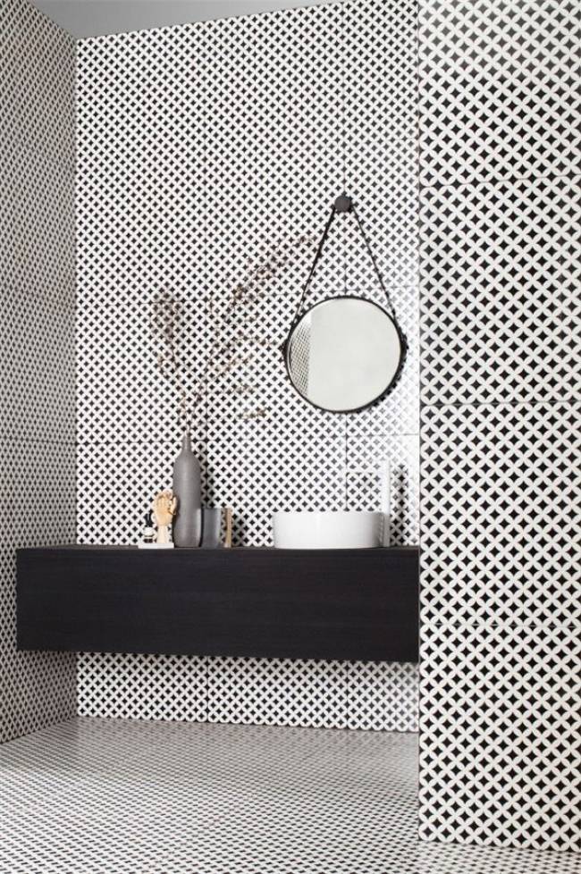 J’aime beaucoup l’idée du miroir rond dans une salle de bain !