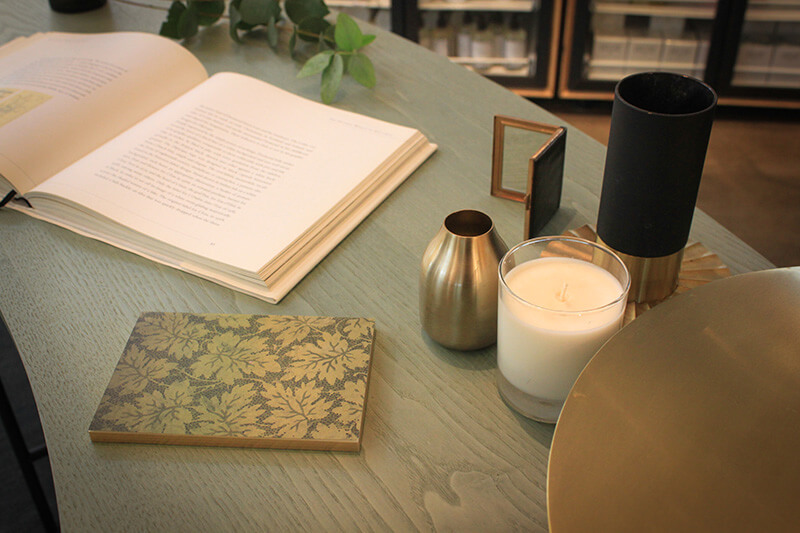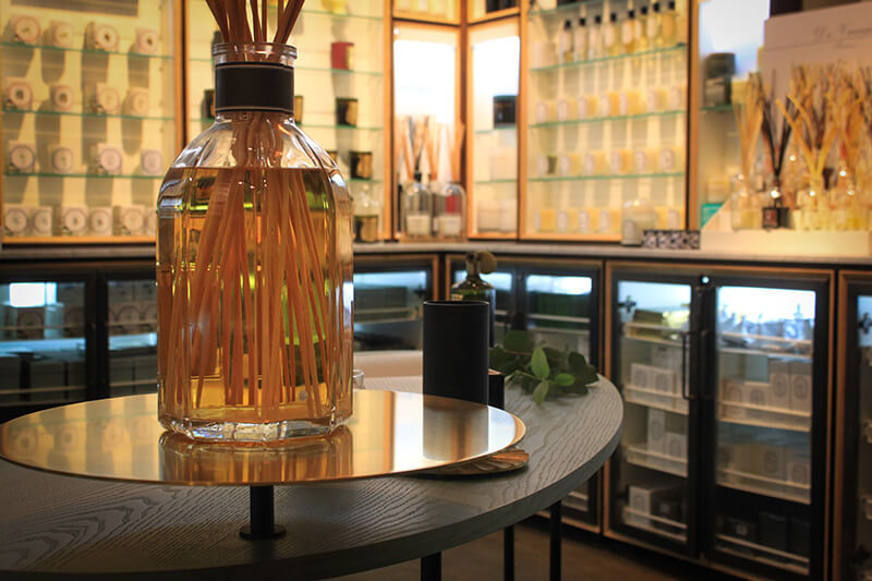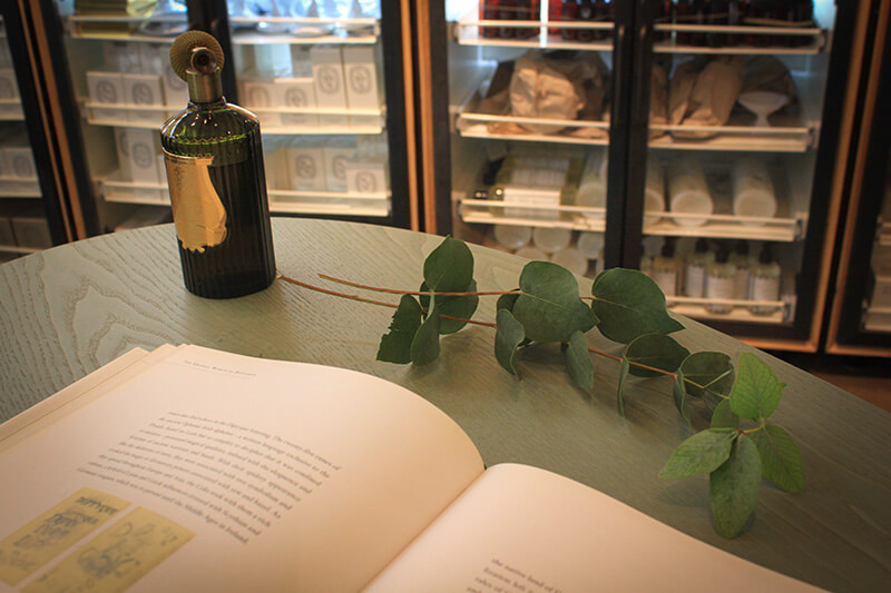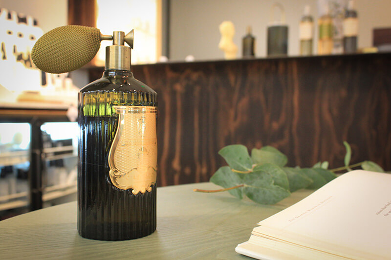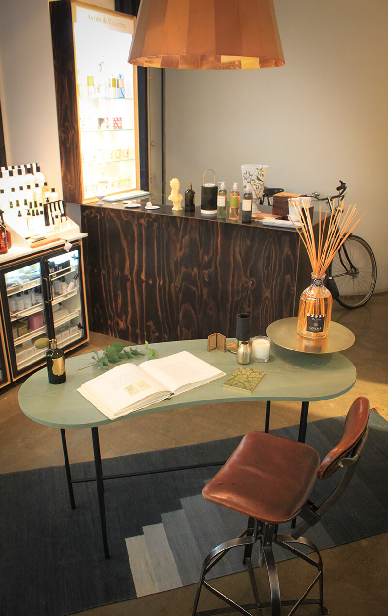 Flacons anciens, manuel botanique, fragrances enchanteresses et objets chinés ont tout simplement trouvé leur place pour créer une ambiance mystique, baigné par une douce lumière cuivrée.