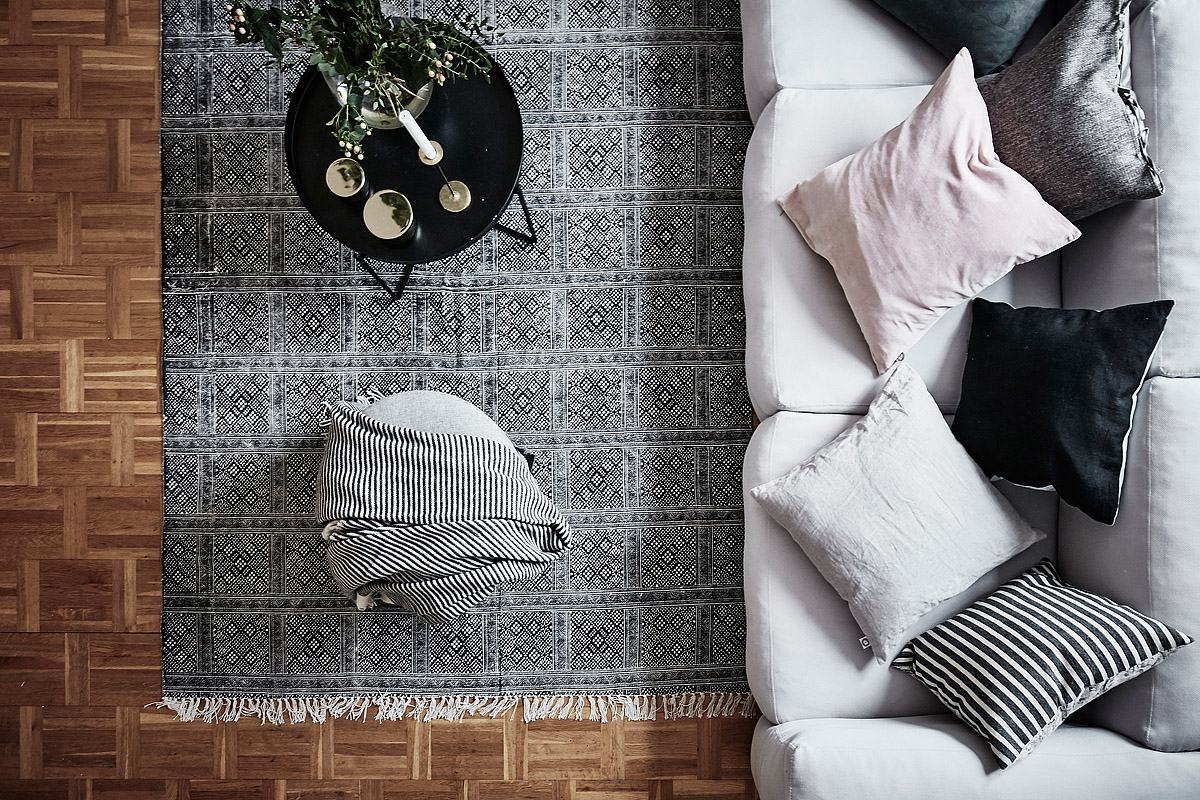 Dans cet appartement à l’ambiance nordique, un énorme tapis graphique vient apporter une touche de style ethnique dans le salon.