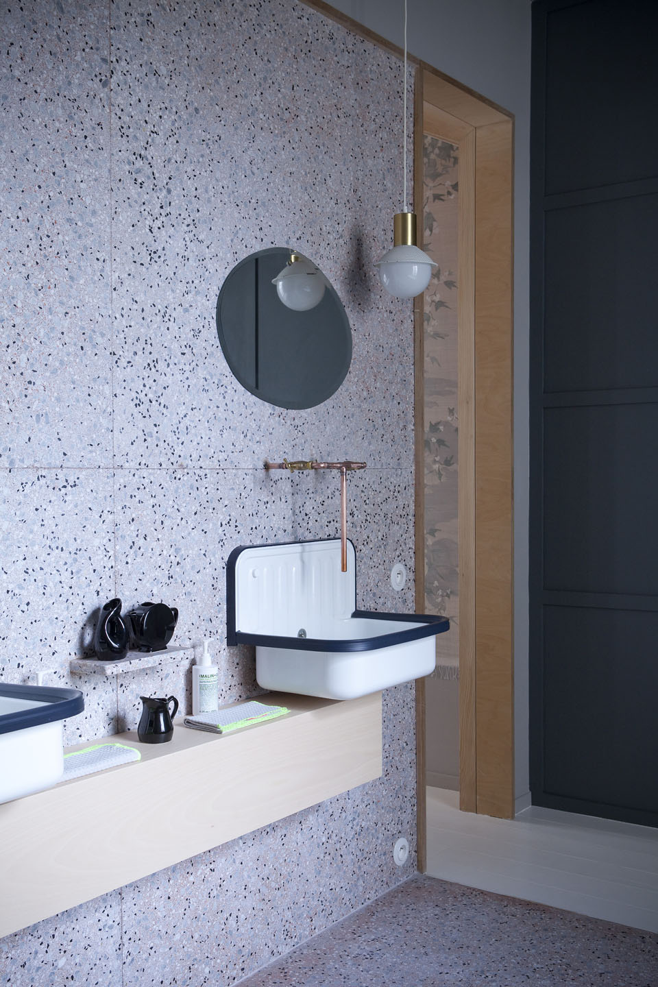 Parfait pour apporter un peu de matière et de texture, le terrazzo se retrouve ici sur les vasques, réalisées sur-mesure.