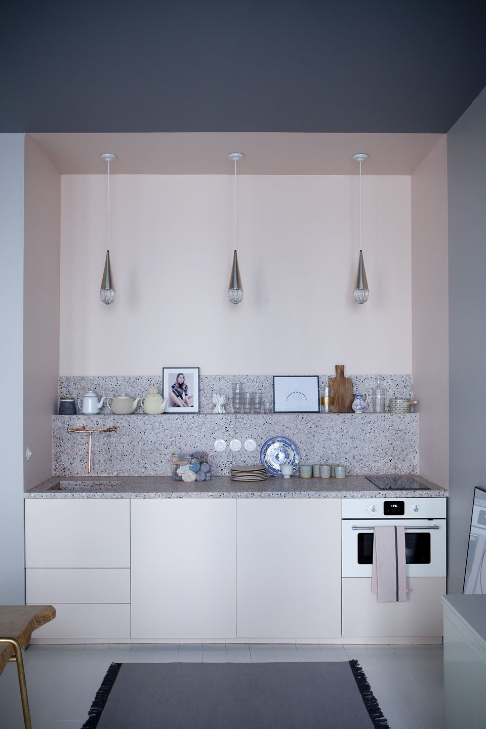 Encore une belle cuisine en terrazzo. Ici, il est utilisé pour le plan de travail, la crédence et le petit retour qui forme une belle étagère murale.