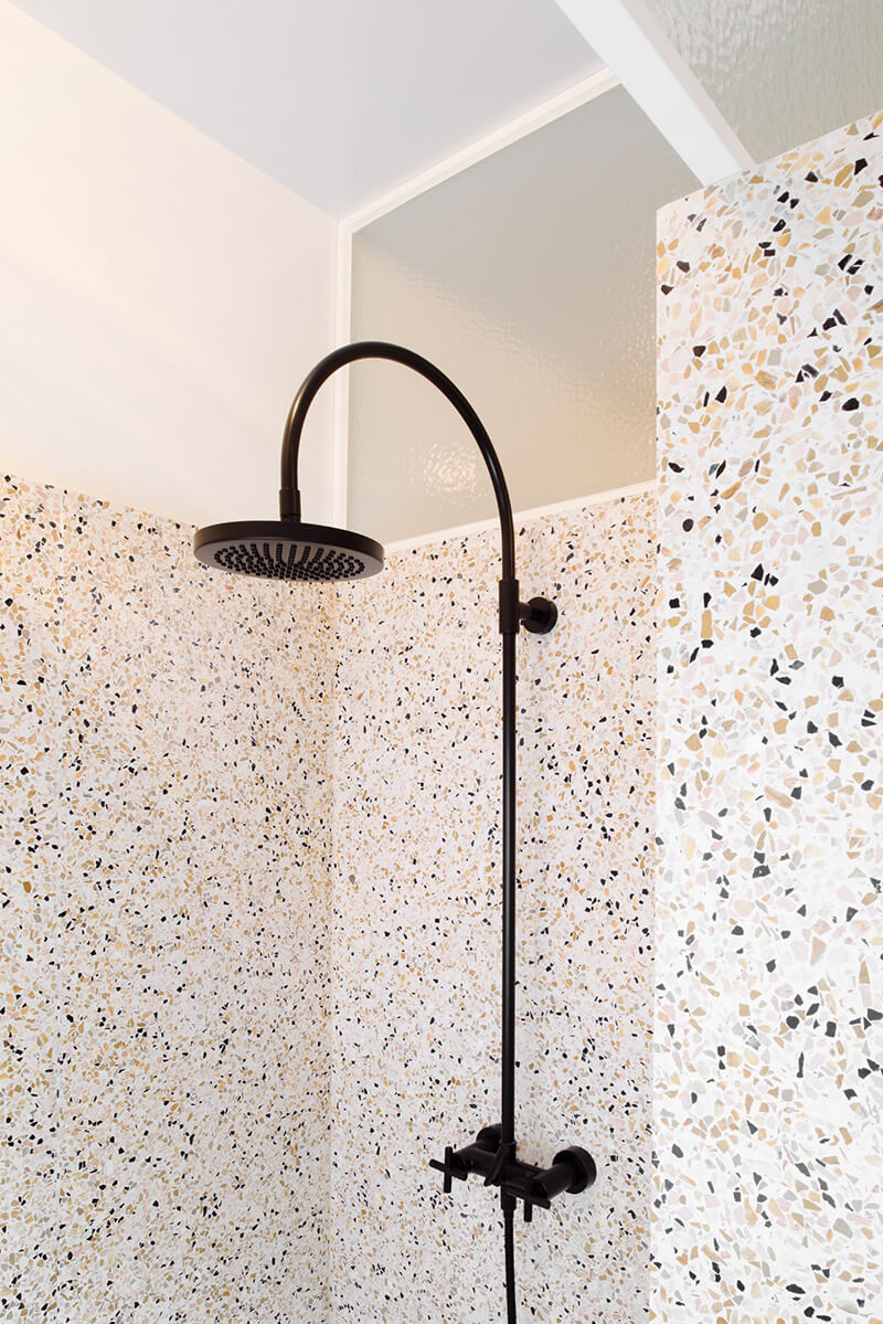 Ici, le terrazzo habille aussi bien le sol que le mur de la douche, créant ainsi une unité visuelle très intéressante.