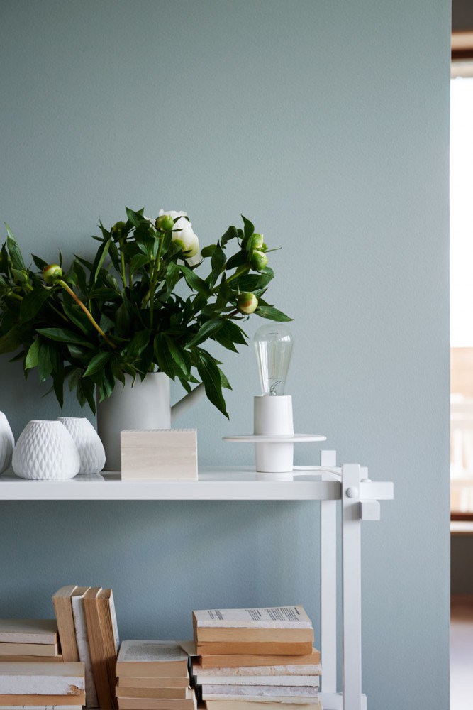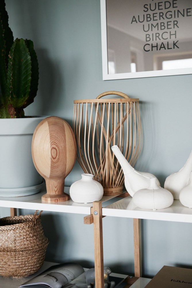 On aime : la couleur des murs, à la fois lumineuse et forte en caractère. Les cactus, totalement dans la tendance green. Et l’accumulation d’objets blancs sur l’étagère.