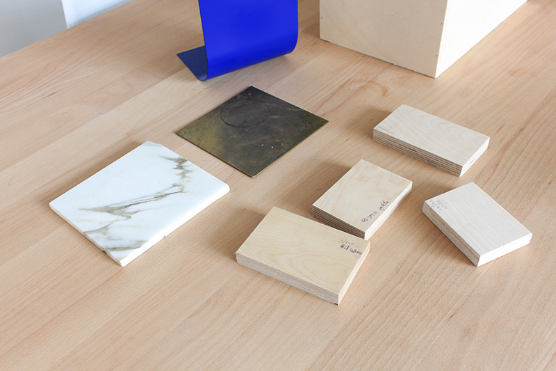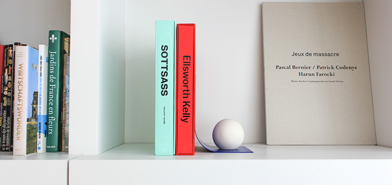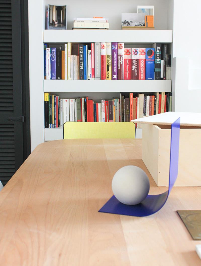 Ce jour-là, Marie et Phil m’ont présenté en exclusivité Murakami, un objet qu’il ont imaginé pour DesignerBox. Ce serre livre est un savant mélange de matière et de textures : la feuille d’aluminium laquée répond parfaitement à une boule de béton brut. Un objet élégant et intemporel, à l’image des créations du studio Dessuant Bone.