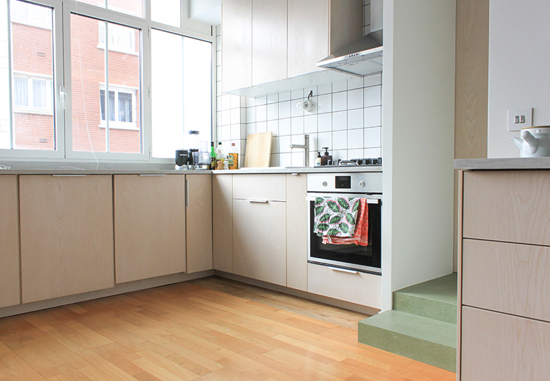 La cuisine a été customisée avec des portes en frêne naturel. Le carrelage, d’origine, rappelle celui de la salle de bain. Pour le plan de travail, Marie et Phil ont opté pour un faux béton ciré, très facile d’entretien.